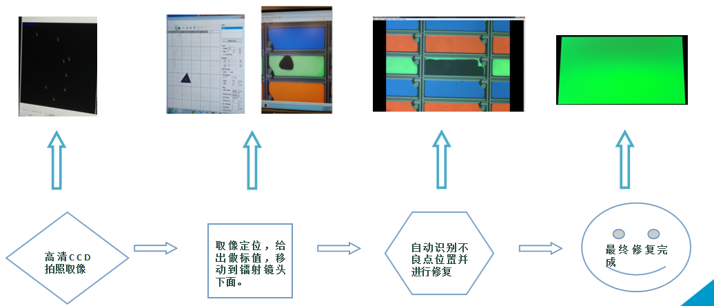 主要應(yīng)用于TFT-LCD、IPS、LTPS、OLED等顯示面板行業(yè),針對制程當中發(fā)光區(qū)域內(nèi)產(chǎn)生的亮點、灰亮點、亮線不良進行鐳射修復(fù)。整個修復(fù)過程是通過高清像素CCD自動定位,拍照取像分析,給出不良點坐標,然后計算機根據(jù)指令將修復(fù)用的鐳射鏡頭移動到位,自動識別出不良點的形狀大小,激光會做出不同方式的維修。詳見如下圖解: