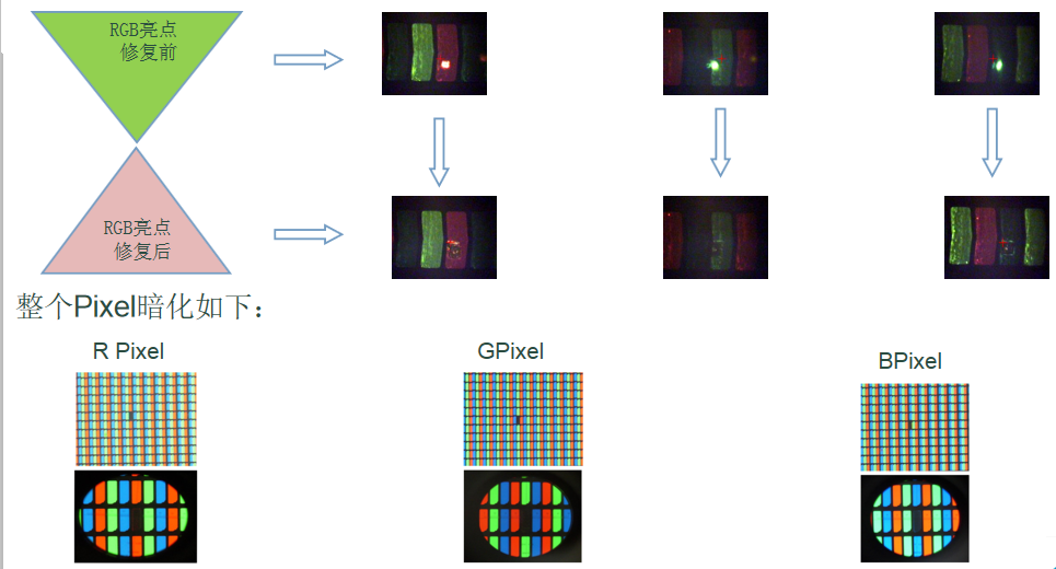 超快激光亮點修復(fù)特點:可以直接針對一個pixel里的異物亮點進行單獨暗 化修復(fù),而不影響周圍區(qū)域發(fā)光。